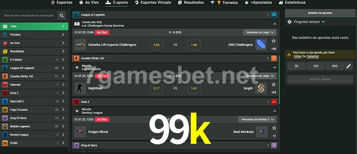 O 99k oferece uma grande seleção de opções de apostas em e-sports com probabilidades competitivas